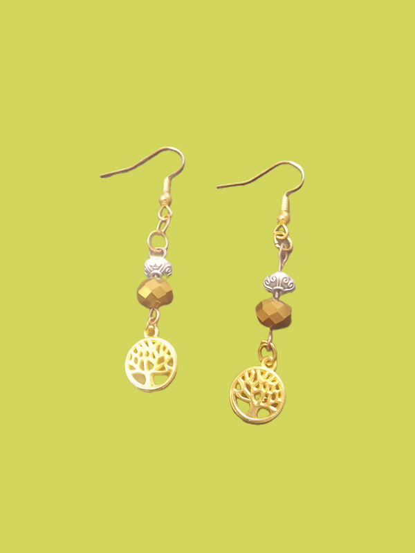 Graceful and timeless, the Golden Serenade earrings embody the harmony of elegance and nature. Featuring a delicate Tree of Life motif suspended from shimmering golden beads, these earrings capture the beauty of light dancing through leaves. Their radiant design symbolizes growth, strength, and eternal connection — making them a perfect accessory for both refined evenings and meaningful everyday wear.